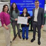 El consejero delegado de Hidraqua, Jordi Azorín, y la presidenta de la APPA, Rosalía Mayor, han entregado el VII Premio de Periodismo Ambiental Hidraqua-APPA al grupo de cinco estudiantes de Periodismo Científico de la Universidad Miguel Hernández compuesto por Alexandra Chicaiza y Juan Manuel Sabater (que lo han recogido en nombre de sus compañeros), Paula Miralles, Iñaki Vizcaíano y Fabio Galiana.