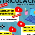 El periodo de presentación de solicitudes de admisión telemática en Infantil y Primaria será del 6 al 14 de mayo. El 4 de junio se publicarán las listas provisionales, abriéndose un plazo de reclamación telemática que finalizará el 6 de junio. Las listas definitivas del alumnado admitido en cada centro saldrán publicadas el 18 de junio.
