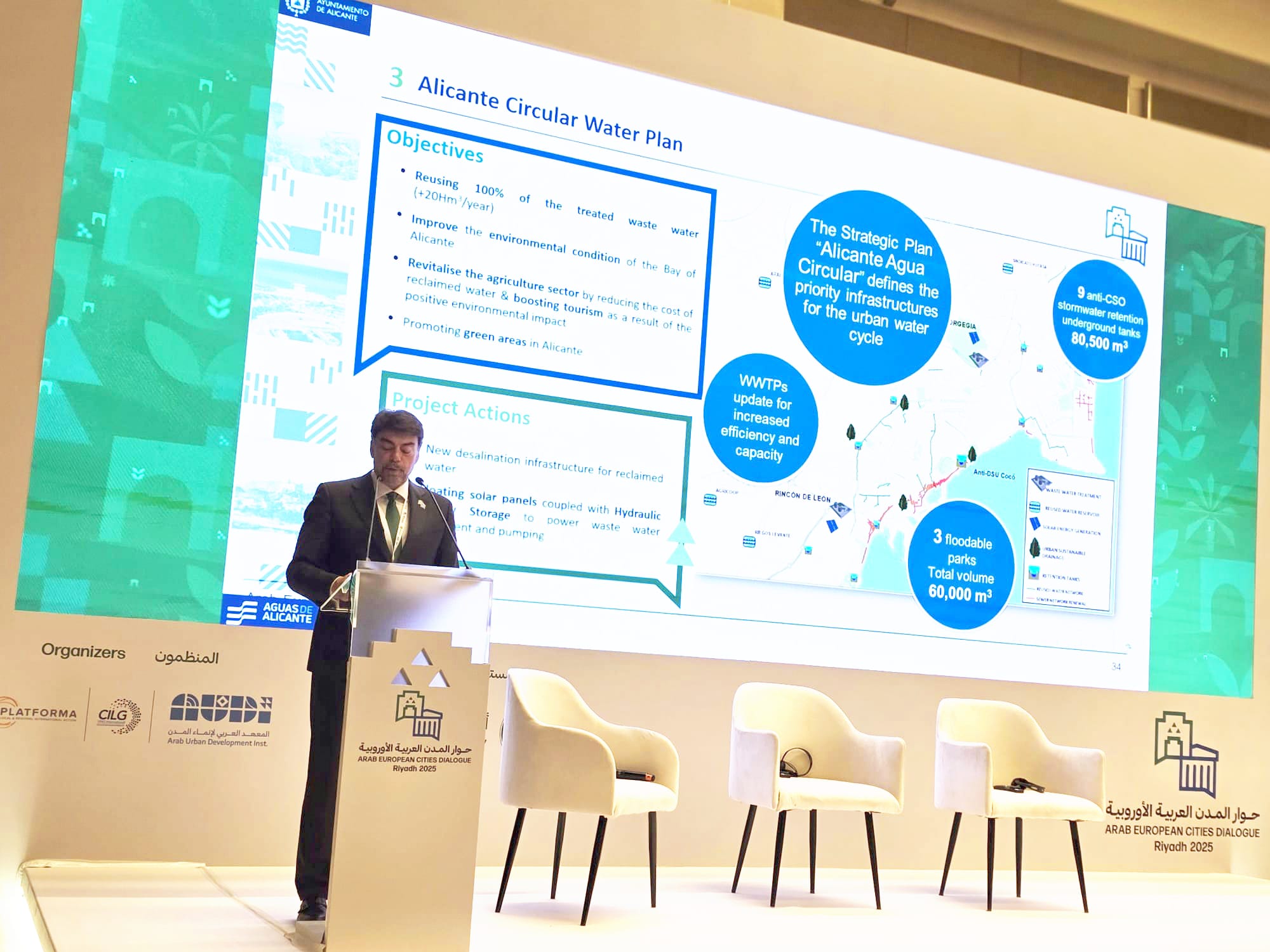 El alcalde de Alicante, Luis Barcala ha intervenido este martes en Riyadh en la jornada de clausura del Foro de Diálogo de Ciudades Árabes y Europeas (AECD 2025) con la presentación de la estrategia municipal ‘Alicante Aguar Circular’ para el máximo aprovechamiento de los recursos hídricos, que está considerada por la organización de la cumbre saudí como “un ejemplo de gobernanza eficaz y exitosa, que ha generado resultados positivos en la mejora de la participación ciudadana y el desarrollo local”. El primer edil ha utilizado el árabe al principio y al final de su intervención, lo que ha cosechado el aplauso de los asistentes a esta sesión de trabajo, así como el inglés y el español en la parte central de su exposición.