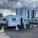 En la entrada principal de Pelikano Unusual Club se puede ver un grupo de caravanas estacionadas en una zona de aparcamiento. Las caravanas, de usuarios extranjeros que viene a València en busca del buen tiempo y la playa, se adueña del lugar fuera de temporada y reculan cuando llega el verano. La Torre de Guaita, la marjal, el paseo marítimo, el Mediterráneo… la zona de aparcamiento es idílica y estimulante.
