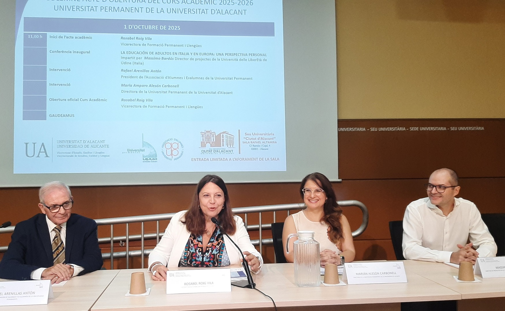La vicerrectora ha querido hacer hincapié en la importancia de la UPUA como vínculo entre sociedad y universidad, así como subrayar la alta implicación de sus estudiantes, a los que ha calificado de entusiastas y participativos. Rosabel Roig, ha presentado al ponente invitado, Massimo Bardus, profesor de la Università delle LiberEtà de Údine (Italia), quien fue alumno Erasmus de la UA y que ha impartido la conferencia La educación de adultos en Italia y en Europa.