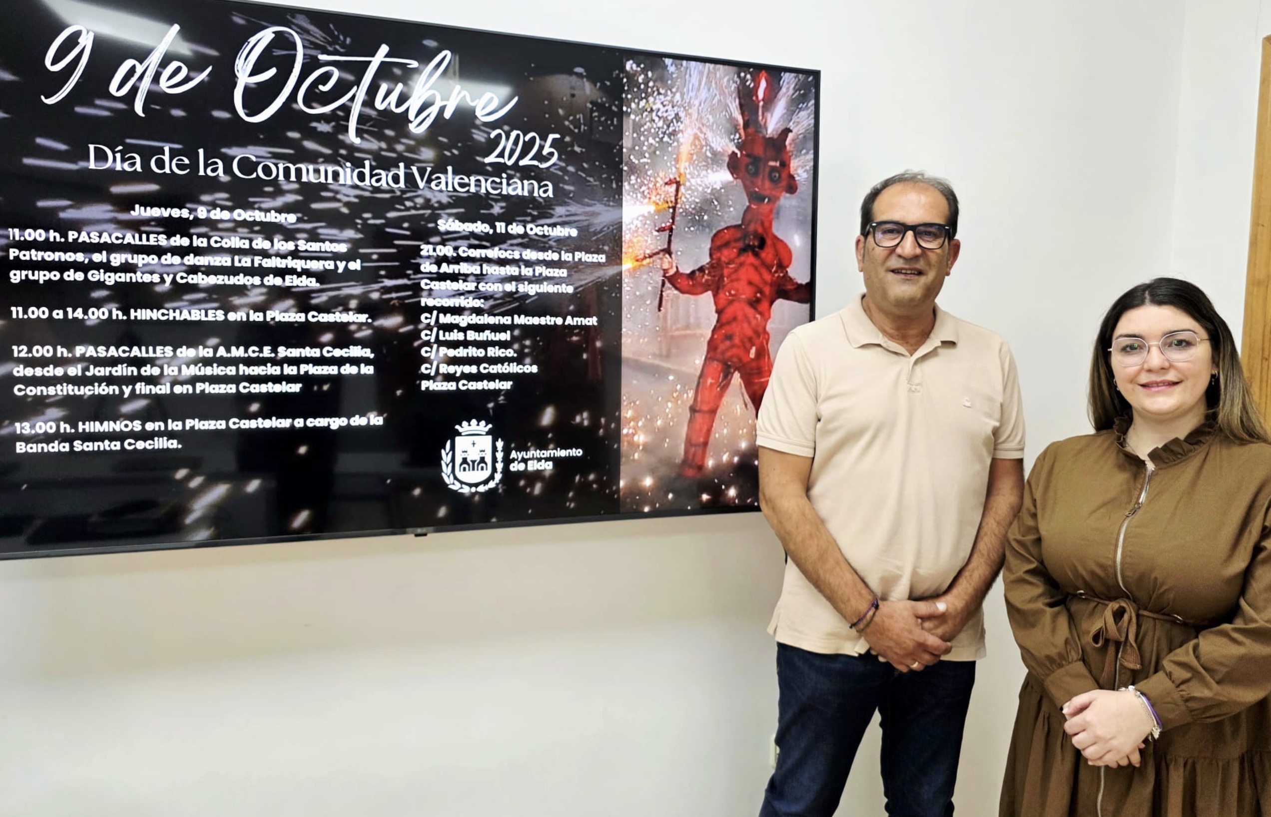 El Ayuntamiento de Elda celebra el 9 de Octubre, Día de la Comunidad Valenciana, con una serie de actos organizados por las Concejalías de Juventud y de Fiestas. La celebración comenzará el jueves 9, a las 11:00 horas, con un pasacalles de La Colla de los Santos Patronos, el grupo de danza La Faltriquera y el grupo de Gigantes y Cabezudos de Elda, con salida en la calle Pablo Iglesias y finalización en la Plaza Castelar.
