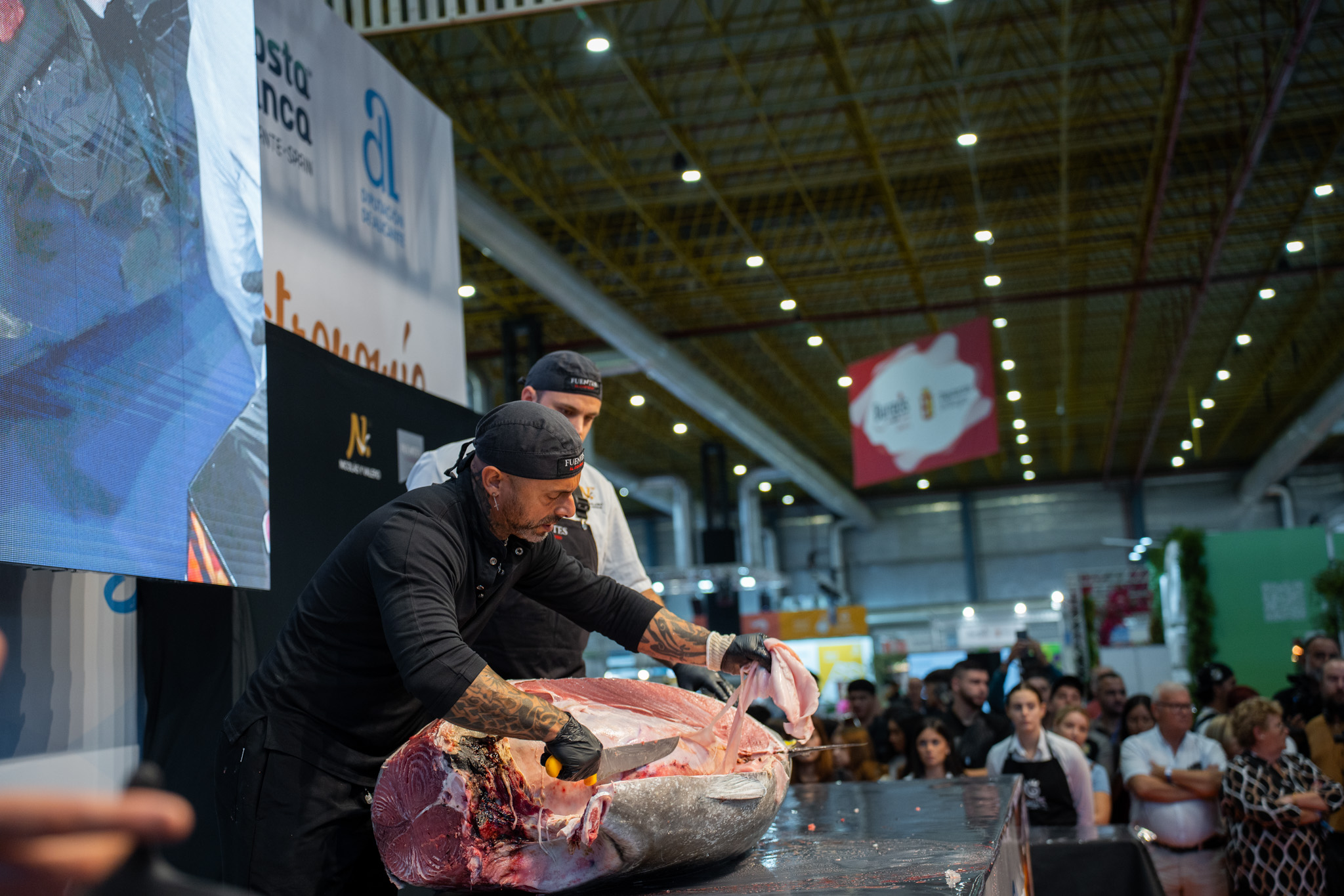 El espacio Saborea Costa Blanca ha acogido esta mañana uno de los espectáculos más impresionantes de la feria, el ronqueo del atún rojo, uno de los productos estrella que ofrece el Mediterráneo. Una pieza de 225 kilos que fue pescada ayer y han traído desde el vivero de San Pedro del Pinatar de la empresa Fuentes El Atún Rojo y ha sido despiezada con técnicas artesanales por parte de los profesionales de la compañía Nicolás y Valero.