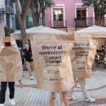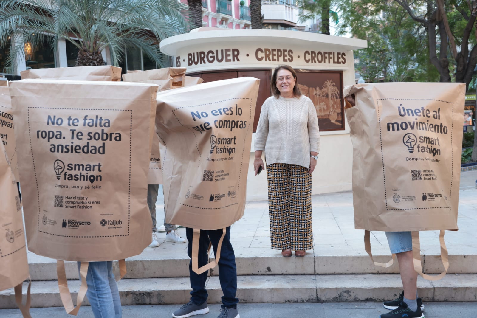 Para concienciar sobre el tema, esta mañana, antes de la presentación del informe, una veintena de personas han recorrido las calles adyacentes al Ayuntamiento de Elche portando grandes bolsas en la cabeza. Los mensajes que podían leerse invitaban a repensar ciertos comportamientos y sentimientos que surgen en torno al proceso de la compra de moda