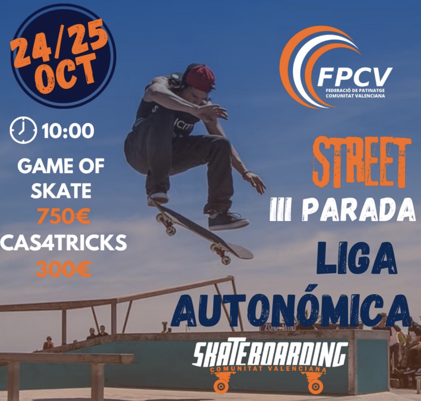 El Skatepark de la plaza Portal del Clot de Xàbia será el escenario este fin de semana, 24 y 25 de octubre, de la III Parada de la Liga Autonómica de Skateboarding Street, una cita organizada por la Federación de Patinaje de la Comunitat Valenciana (FPCV) con la colaboración de la Regidoria de Joventut del Ajuntament de Xàbia, PlayJove, la Diputació d’Alacant, Active Xtreme y la Generalitat Valenciana.