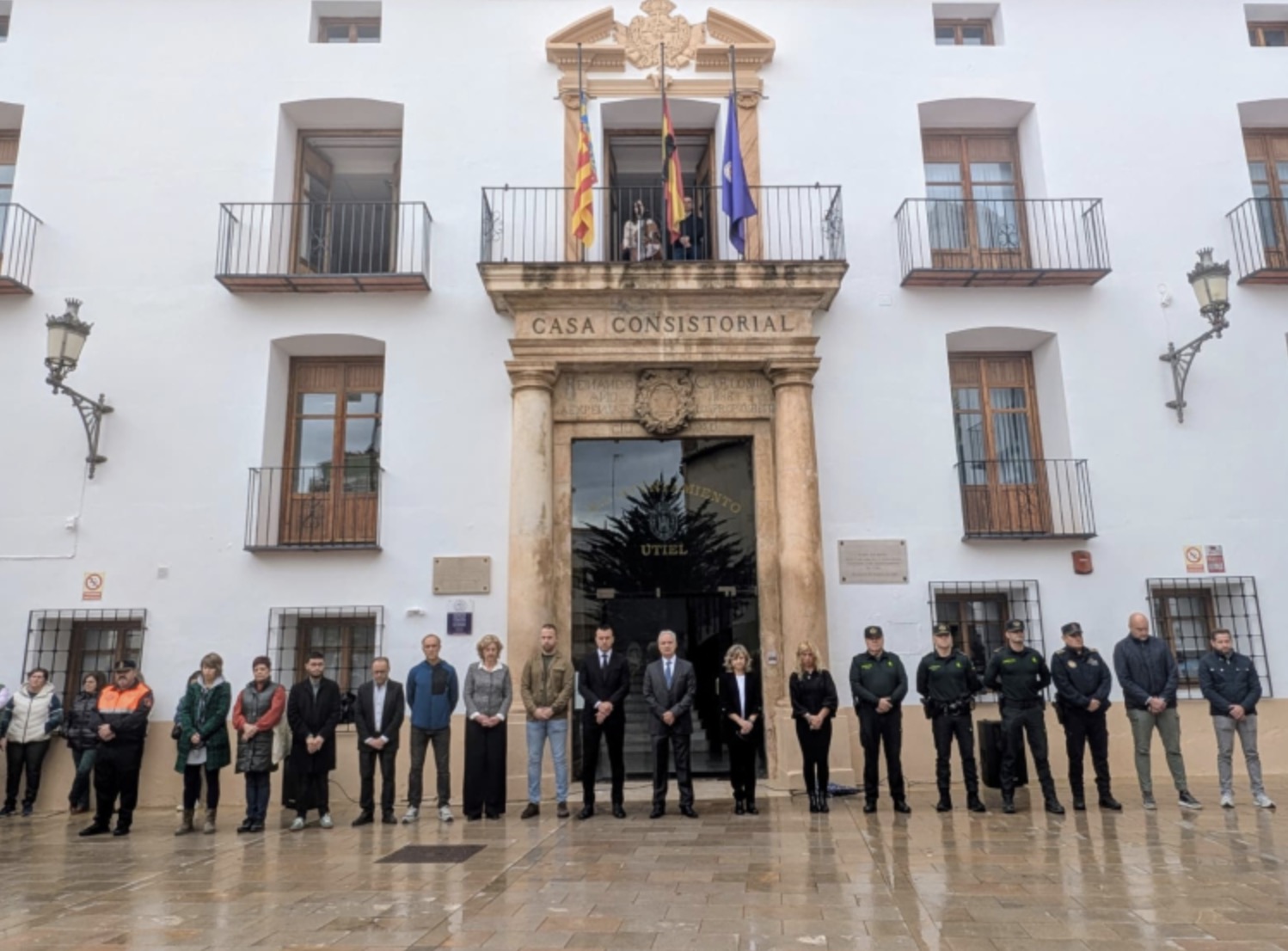 El acto, celebrado en la Plaza del Ayuntamiento de Utiel con las banderas a media asta y crespón negro, ha reunido a numerosos vecinos que han querido mostrar sus condolencias por los 6 vecinos fallecidos en Utiel y como acompañamiento a todas las personas que están sufriendo las consecuencias de la DANA.