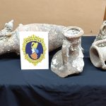 La primera de estas actuaciones la efectuaron el 12 de septiembre los agentes adscritos al Grupo de Patrimonio Histórico con sede en Alicante. Dentro de sus labores operativas de protección del patrimonio cultural, localizaron en las oficinas de una empresa de calzados de Santa Pola dos ánforas del periodo romano con desperfectos y un cuello del mismo tipo de vasija, así como un recipiente cerámico de la época medieval con restos marinos, además de un coral fosilizado.