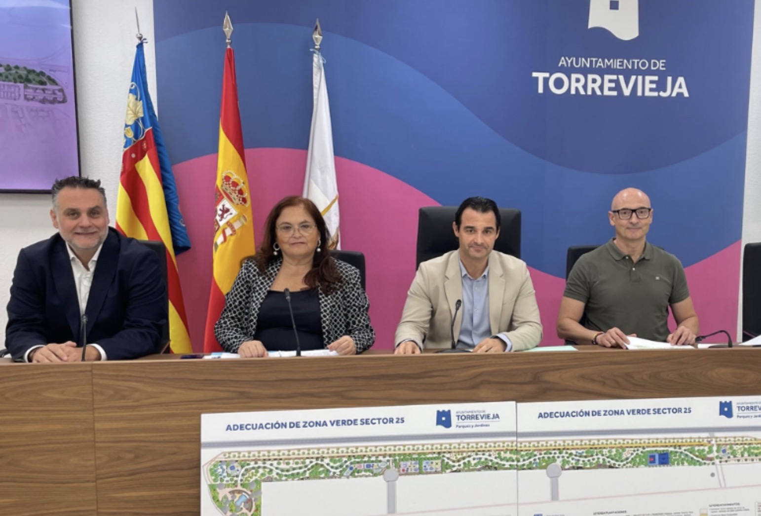 En la mañana de hoy ha sido presentado el proyecto de ejecución de la nueva zona verde que el Ayuntamiento de Torrevieja va a crear en el Sector 25, que mañana viernes será aprobado en Junta de Gobierno Local. El alcalde de Torrevieja, Eduardo Dolón; la concejal de Parques y Jardines, Concha Sala; el ingeniero municipal, Juanfran Pérez, y el gerente de Actúa, Manuel Iván Pérez, han ofrecido los detalles de esta nueva zona verde que, con 70.000 metros cuadrados y 900 metros lineales de longitud, es una de las de mayores dimensiones del término municipal de Torrevieja y la más amplia a desarrollar incluida en el contrato municipal de zonas verdes.