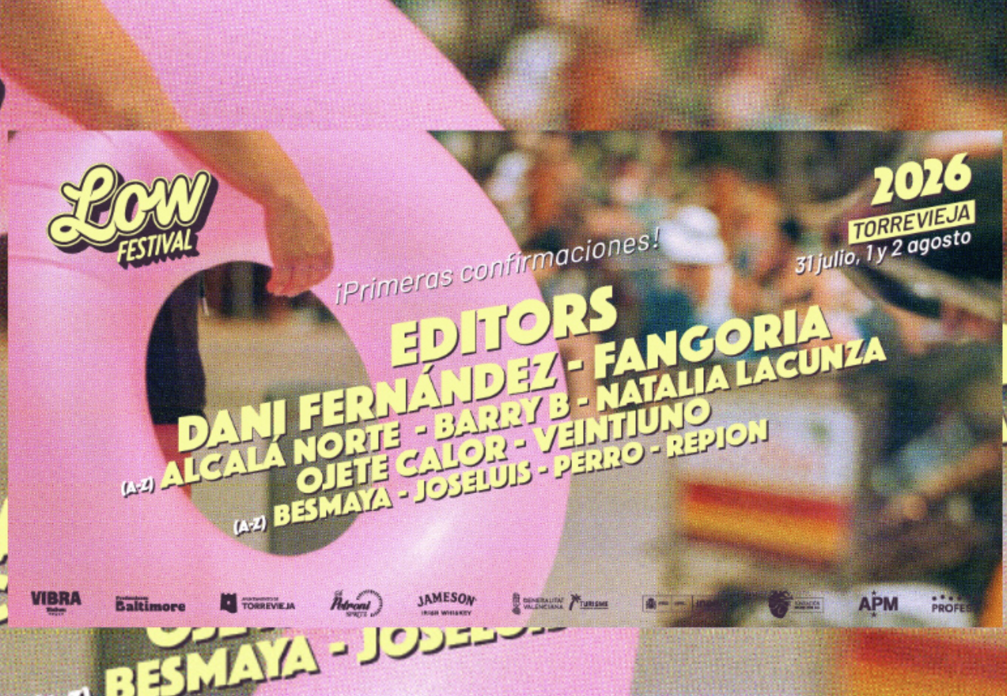El director de Low Festival, José Manuel Piñero, y los concejales de Turismo y Juventud del Ayuntamiento de Torrevieja, Rosario Martínez y Domingo Paredes, han anunciado oficialmente la ciudad de la sal como la nueva sede del festival más grande de la provincia de Alicante –y uno de los diez más importantes de España– y han descubierto sus 12 primeros nombres confirmados del cartel: Editors, Dani Fernández, Fangoria, Alcalá Norte, Barry B, Natalia Lacunza, Ojete Calor, Veintiuno, Besmaya, joseluis, Perro y Repion. Un cartel que combina grandes leyendas con los talentos emergentes más vibrantes del panorama nacional e internacional.