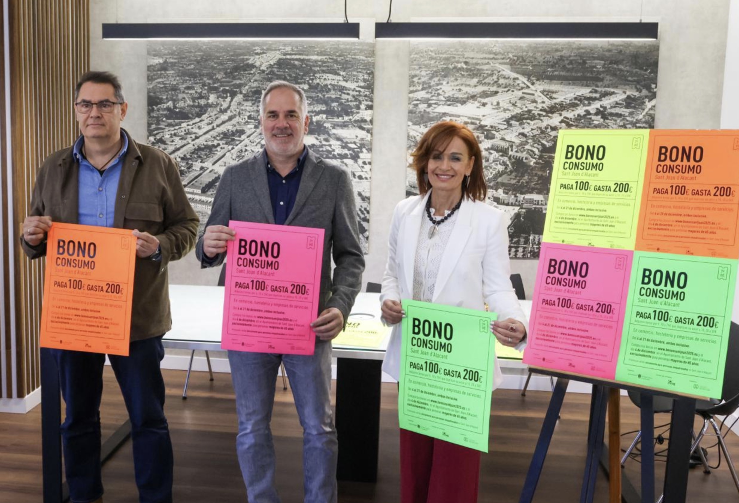 Para dar a conocer las características del Bono Consumo 2025, esta mañana ha tenido lugar una rueda de prensa en la que han participado el alcalde de Sant Joan, Santiago Román, la concejala de Fomento Económico, Charo Tomás, y el concejal de Comercio, Manuel Nieto.
