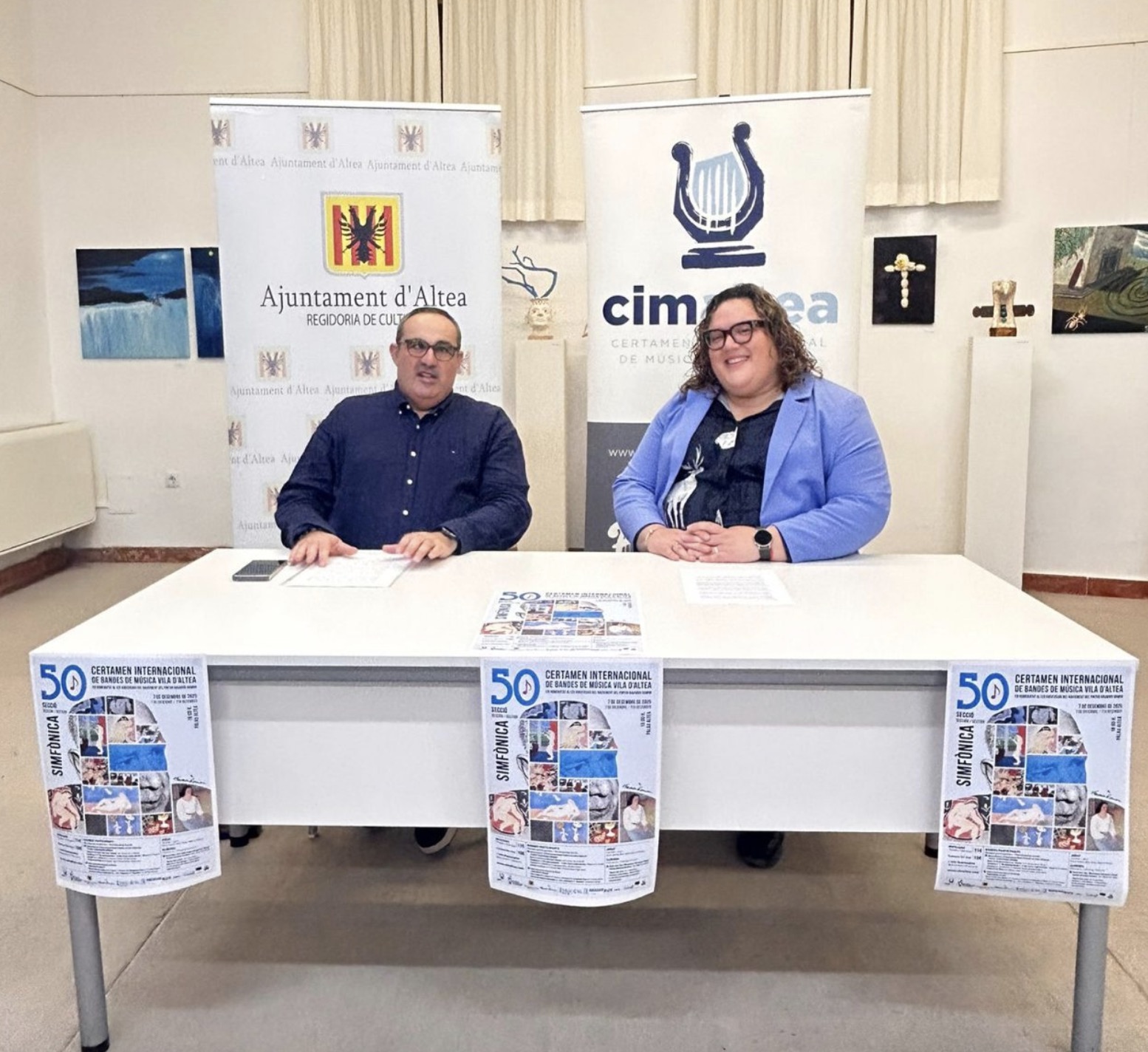La concejala de Cultura, Pepa Victoria Pérez, y el presidente de la Sociedad Filarmónica Alteanense (SFA), Francis Alvado, han presentado en la Casa de Cultura el Certamen Internacional de Bandas de Música Vila d’Altea, que este año celebra el acto final de su 50º aniversario (50 CIMALTEA) con la Sección Sinfónica. Serà el domingo 7 de diciembre a las 16:00 horas en Palau Altea Centre d’Arts.