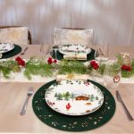 Este año me voy a decantar por el color dorado de base y lo voy a complementar con el color verde, apostando por él en los manteles individuales, toques en los platos y colocaré una guirnalda verde en el centro de la mesa.