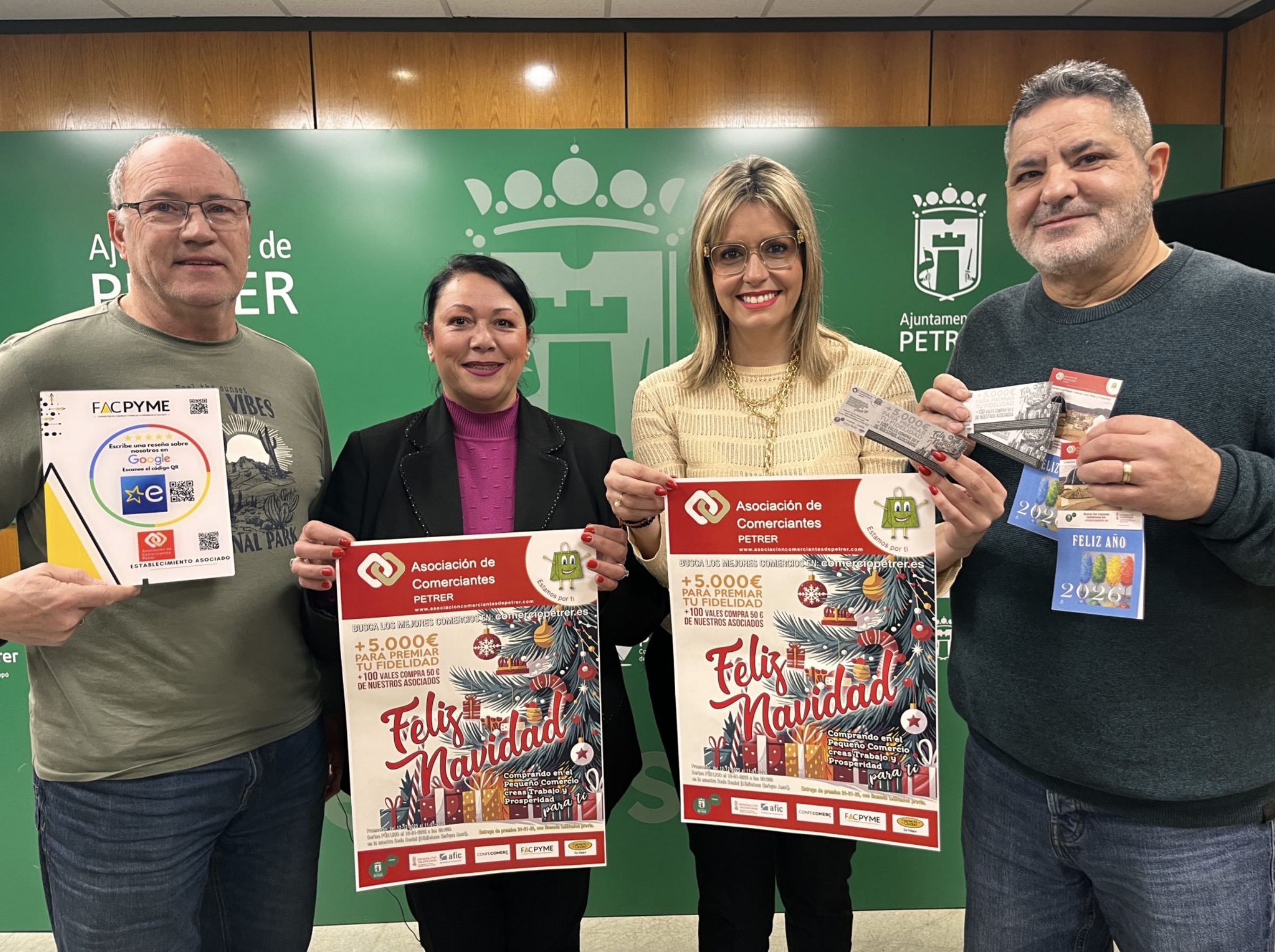 Esta mañana, la concejala de Comercio, Aida Tortosa, y la presidenta, el vicepresidente y el secretario de la Asociación Local de Comerciantes de Petrer, Ana Martínez, Pedro Llobregat y José Yago, han informado de la campaña de Navidad que, un año más, han organizado desde la asociación con la colaboración del Ayuntamiento de Petrer.