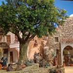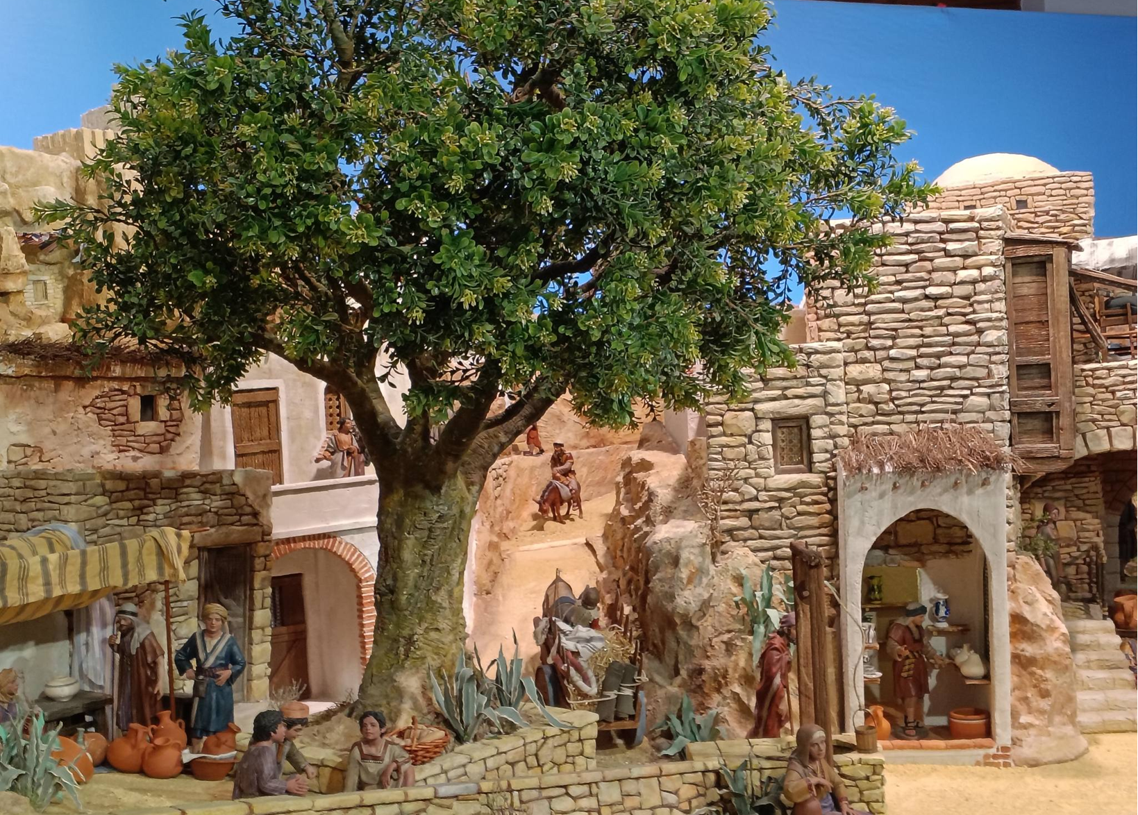 Reparamos ahora en la gran escena central. Aquí se recrea el pueblo de Belén a través de una larga plaza con un castillo al fondo. Destaca un frondoso árbol cuyo tronco se ha elaborado uniendo varias ramas y dándole forma con yeso.