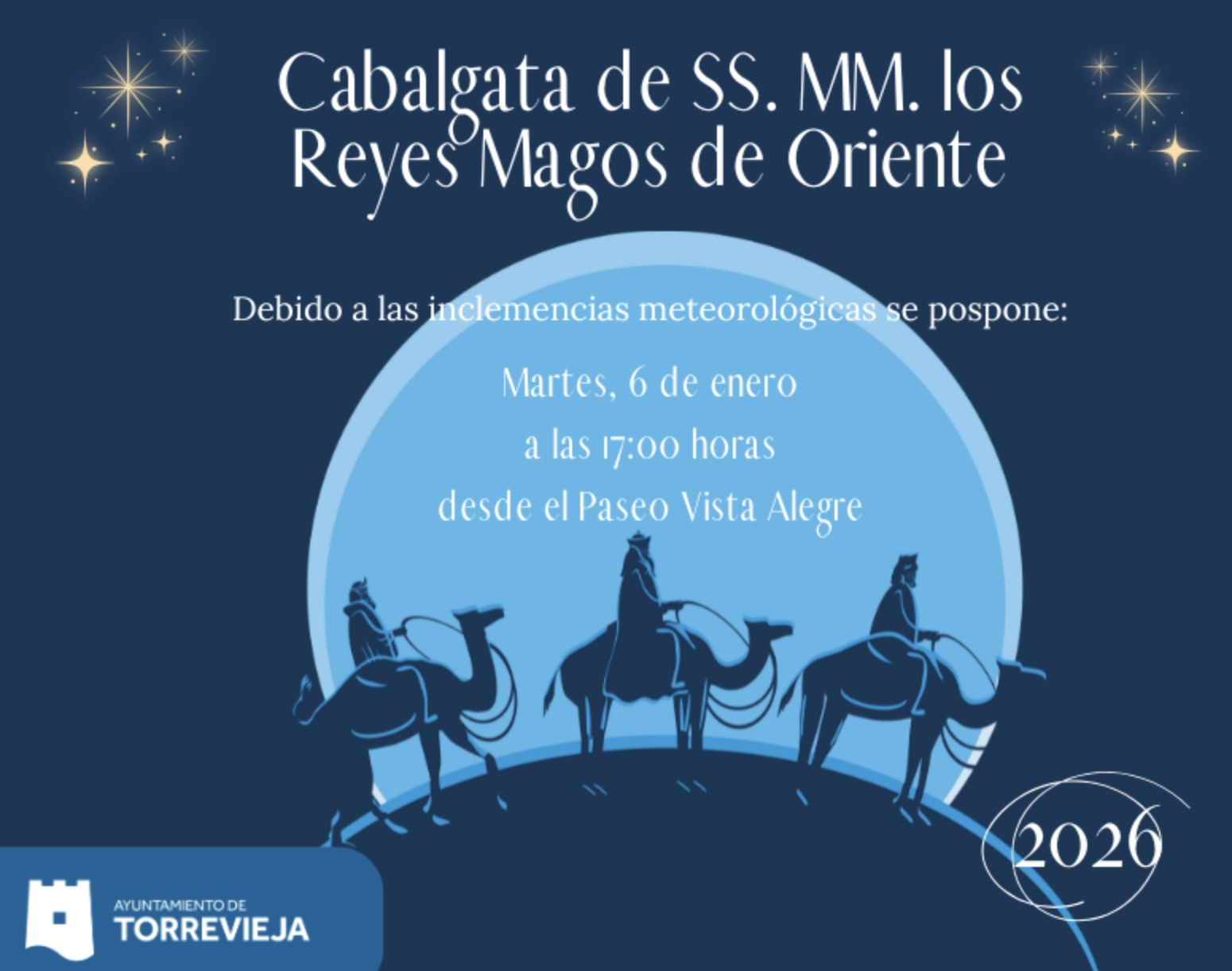 El Ayuntamiento de Torrevieja ha decidido posponer la celebración de la Cabalgata de Reyes, prevista inicialmente para el día 5 de enero, debido a las previsiones meteorológicas adversas anunciadas para esa jornada. De este modo, la Cabalgata se celebrará finalmente el martes, 6 de enero, a las 17:00 horas.