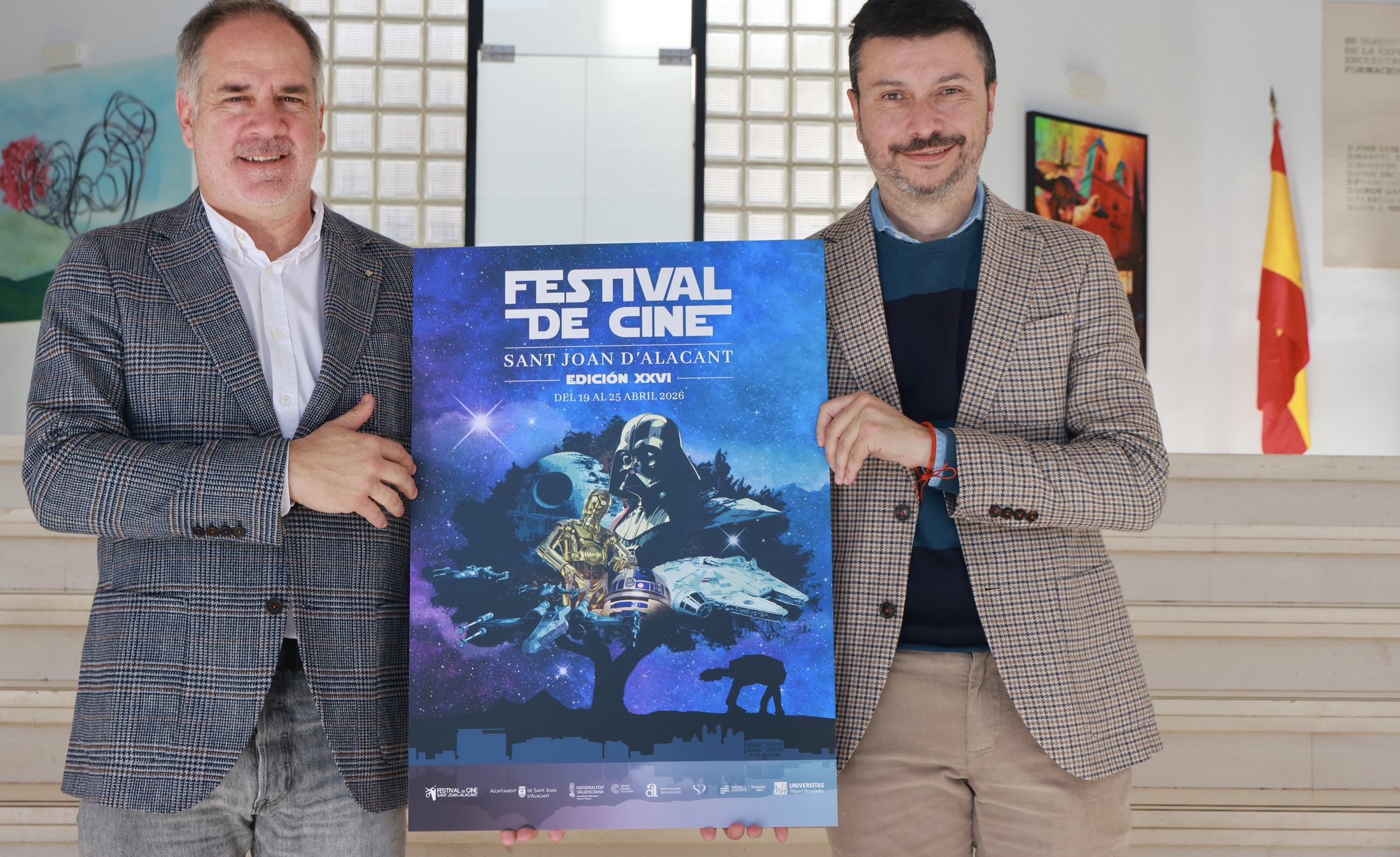 Precisamente, del Festival de Cine 2026 de Sant Joan d’Alacant se ha ofrecido en esta rueda de prensa una gran novedad, como es la presentación de su cartel oficial. Este año, el certamen va a conmemorar el 50º aniversario de la saga Star Wars, por lo que toda la imagen gráfica del festival santjoaner está dedicada al universo galáctico creado por George Lucas hace cinco décadas. En noviembre del 1976, bajo el título ‘Star Wars: From the Adventures of Luke Skywalker’, se publicó la novela considerada la adaptación oficial del guion de la película estrenada unos meses más tarde. También fue en 1976, en la Convención del Cómic de San Diego (la Comic-Com), el evento más importante del año por fans de los cómics, el cine, las series, el anime, los videojuegos y la cultura pop en general, cuando se presentaron los primeros conceptos visuales, con los diseños tempranos de personajes y naves que luego se volverían icónicos, antes de que la película se convirtiera en un fenómeno. Posiblemente se distribuyeron los primeros cómics o se discutieron las adaptaciones que saldrían poco antes y después del estreno de la película, y sobre todo, se generó una expectación previa a uno de los mayores estrenos de la historia, generando gran interés entre los asistentes, mucho antes del estreno de la película que abrió la saga en 1977, llamada ‘A New Hope’ (‘Una Nueva Esperanza’).