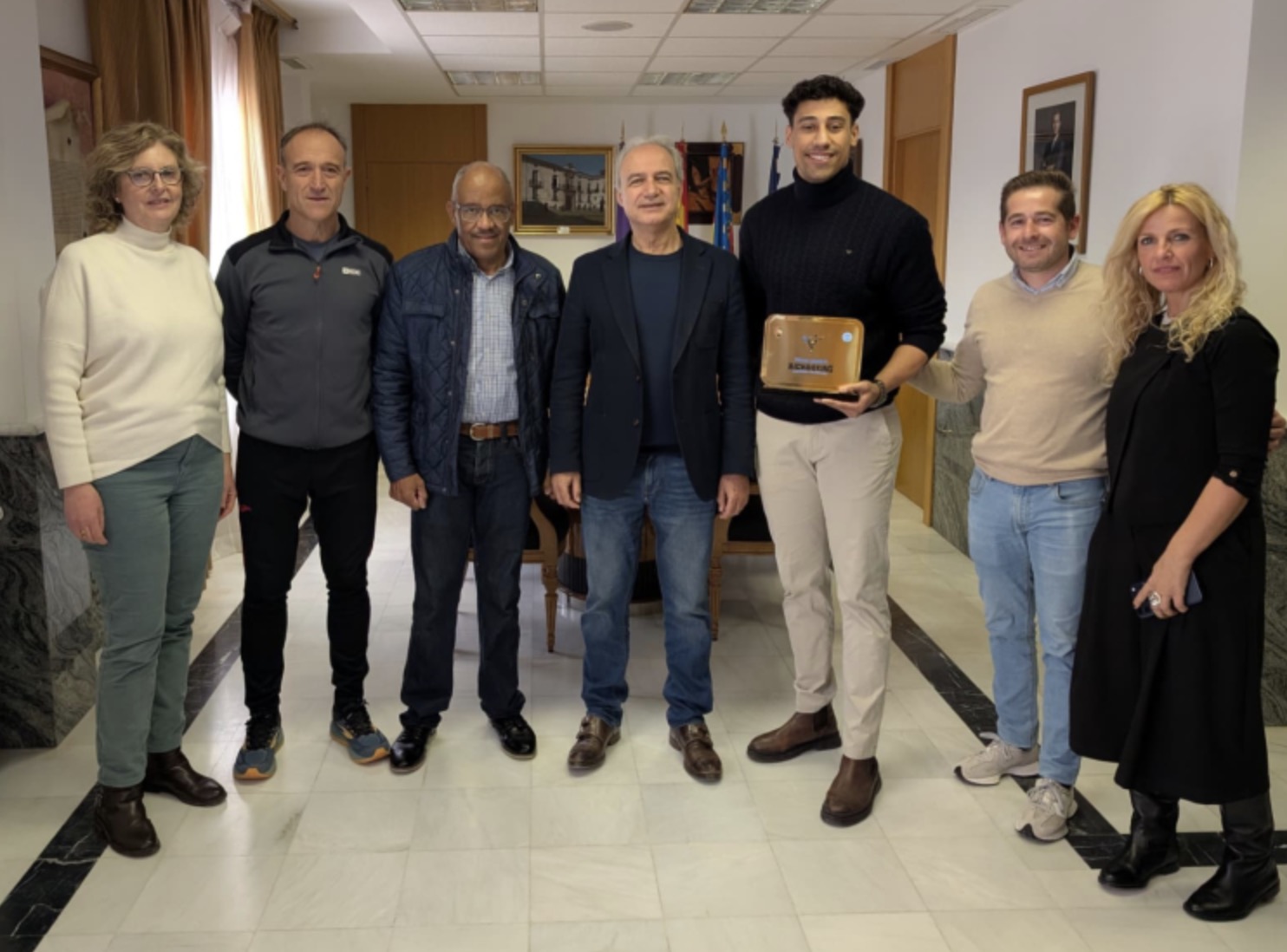 Kevin, acompañado de su entrenador y padre, Patrick Koffi, han explicado tanto al alcalde como al concejal de deportes y miembros de la corporación, los pormenores de esta competición internacional de gran calado.