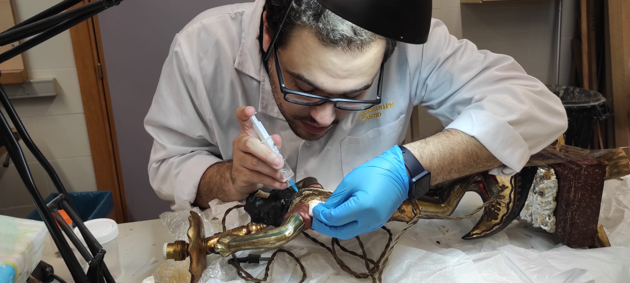 Trabajo principalmente con bienes culturales muebles, especialmente imaginería religiosa y pintura sobre lienzo, así como con soportes tradicionales como la madera policromada. No obstante, la escultura policromada es el ámbito que más me apasiona.