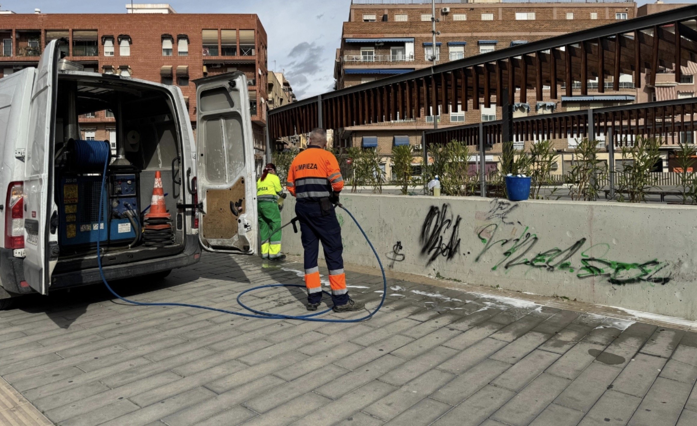 La empresa de limpieza municipal, UTE Elche, ha llevado a cabo más de 300 actuaciones de eliminación de pintadas y grafitis en la vía pública, además de cartelería y adhesivos, a lo largo de 2025 y desde el inicio del año 2026 las actuaciones se han centrado en puntos como el Parque Municipal, Plaza Madrid o Plaza de la Aparadora.