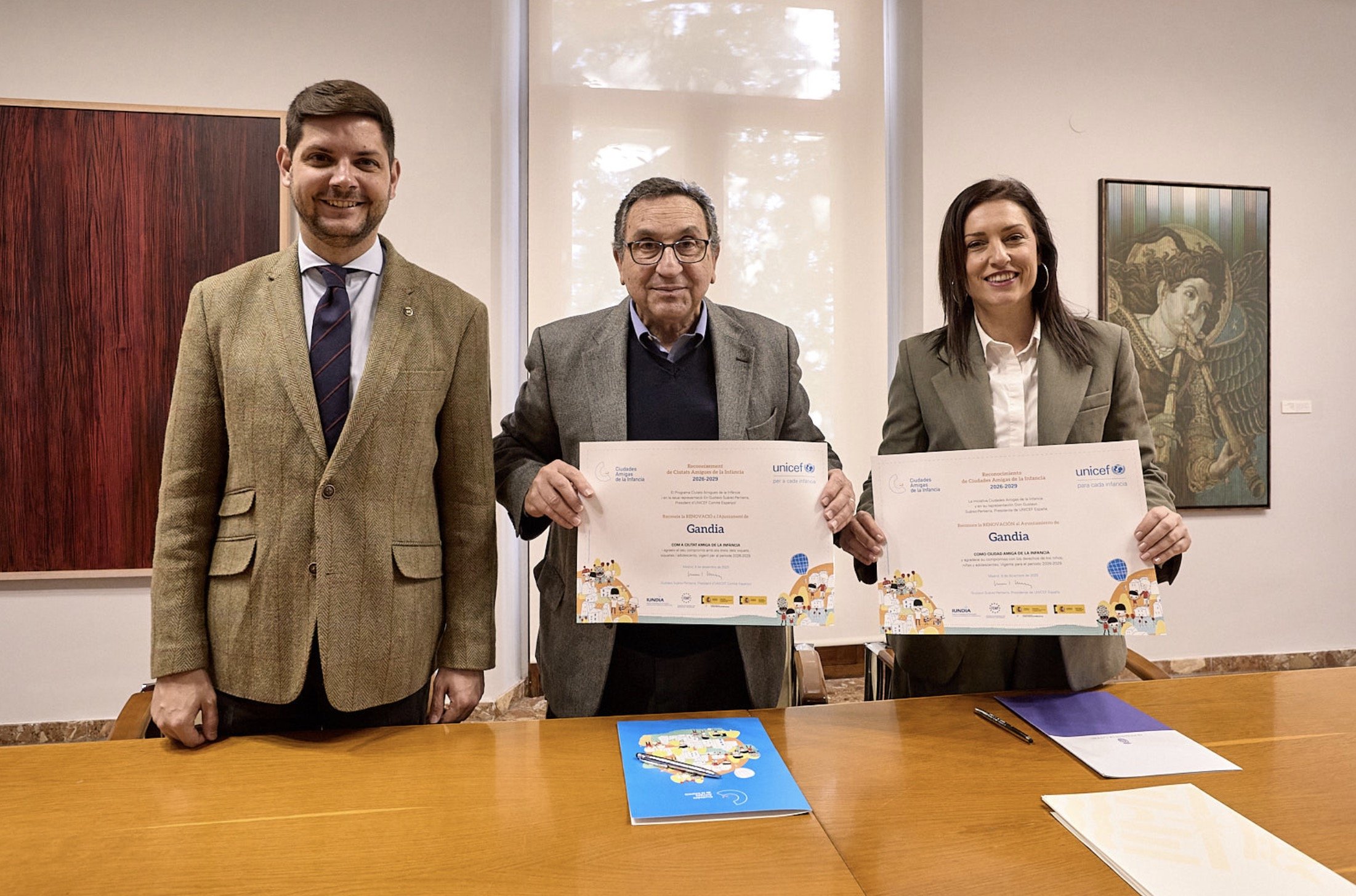 El alcalde de Gandia, José Manuel Prieto, y la coportavoz del Gobierno local y concejala de Educación e Infancia, Esther Sapena, han recibido esta mañana al presidente de UNICEF Comunitat Valenciana, Celestino Suárez Burguet, para firmar la renovación del Sello de Ciudad Amiga de la Infancia – UNICEF, un reconocimiento otorgado por el Comité Español de UNICEF que avala el firme compromiso del municipio con los derechos de la infancia y la adolescencia.