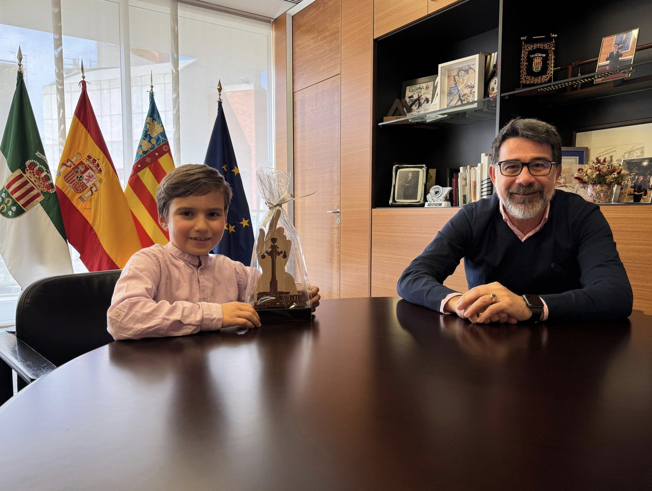 El Ayuntamiento ha confirmado la designación de Marc Lafuente para representar la figura del Niño Sant Vicent en las próximas Fiestas Patronales y de Moros y Cristianos de 2026, que se celebrarán del 10 al 19 de abril. El menor ha recibido una insignia y un obsequio en agradecimiento de manos del alcalde, Pachi Pascual, acompañado por el concejal de Fiestas, Cristian Gil, y, por parte de la Comisión Municipal de Fiestas, Ana Gemma Sevilla.