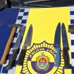 En el momento del registro superficial, se halló en poder del detenido una bolsa con un martillo, una maza y cuatro cuchillos. Posteriormente, el detenido, de 77 años, fue trasladado a un centro médico para su valoración y, posteriormente, a dependencias policiales para ser puesto a disposición judicial.