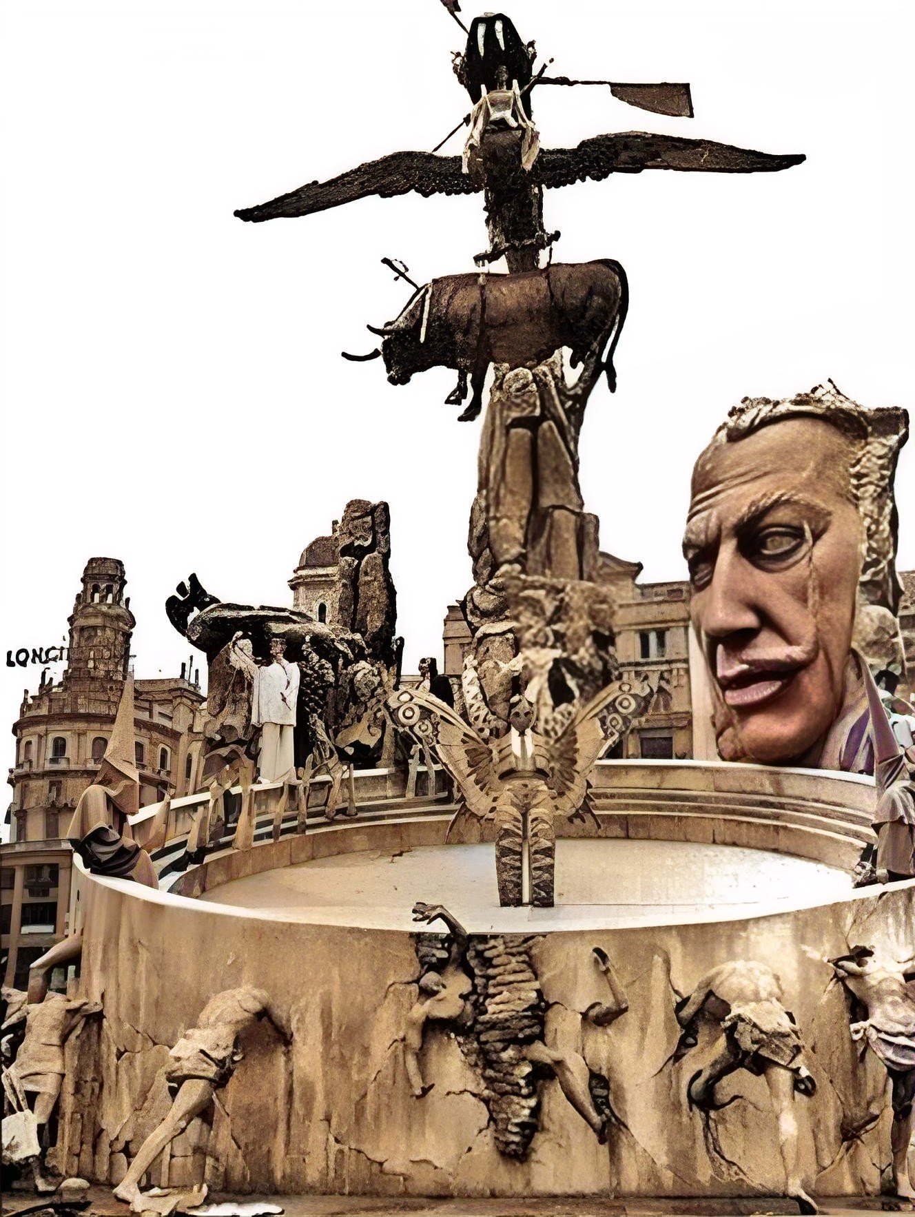 Como ocurrió en las fallas de 1954, con el monumento que diseñó para la plaza del Ayuntamiento (entonces del Caudillo), una ‘Corrida de toros surrealista’, con un torero con alas de mariposa, un helicóptero orgánico (con figuras de cera), una cara gigante mitad Dalí mitad Picasso (ambos se admiraban en lo artístico, pero estaban enfrentados en lo político). Aunque abrió la espita para que otros artistas ajenos a las fallas se implicaran en ellas.