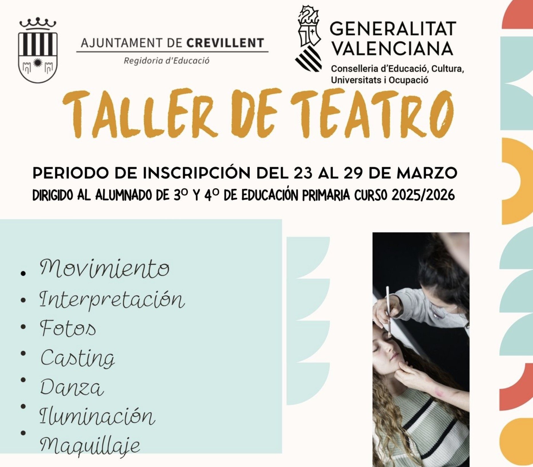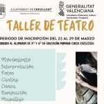 La Concejalía de Educación anuncia la próxima apertura de inscripciones para participar en el taller de teatro que tendrá lugar los días 7, 8, 9, 10 y 13 de abril en la Casa de Cultura José Candela Lledó, en horario de 9:30h a 13:00h. El responsable del área, Antonio Candel Rives, ha apuntado que esta actividad está dirigida al alumnado de 3º y 4º de Educación Primaria de la localidad, contando con 25 plazas disponibles y siendo necesaria la asistencia los 5 días.